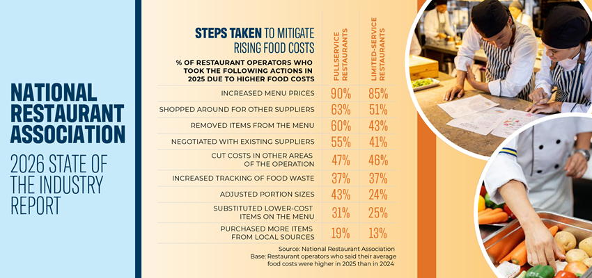Among fullservice restaurant operators, 90% said they’d raised their prices, while 63% sought alternative suppliers and 60% removed items from their menus. Limited-service operators adopted similar strategies, though with less flexibility. About 85% said they’d increased their prices, while 51% sourced new suppliers and 43% reduced menu offerings.