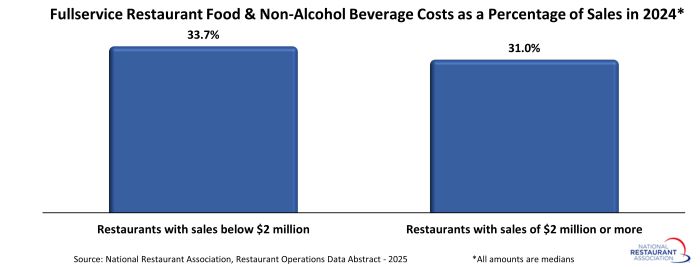Among fullservice operators with annual sales of $2 million or more, food and non-alcohol beverage costs represented a median of 31.0% of sales in 2024. For fullservice respondents with sales below $2 million, food and non-alcohol beverage costs were a median of 33.7% of sales – or nearly 3 percentage points higher.
