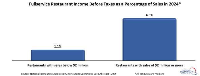 Among fullservice operators with annual sales of $2 million or more, income before taxes represented a median of 4.3% of sales in 2024. For fullservice operators with sales below $2 million, income before taxes was a median of 1.1% of sales – or more than 3 percentage points lower.