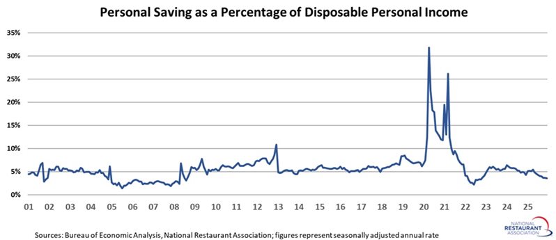 Beyond prices, personal consumption expenditures rose 0.4% in December for the second straight month. Spending on foodservices and accommodations edged up 0.1% in December after jumping by 0.5% in November. Over the past year, total personal spending has grown a healthy 4.7%, with expenditures on foodservices and accommodations up 4.6% since December 2024, signaling surprising resilience in consumer demand despite persistent headwinds and a softer-than-desired reading for December.