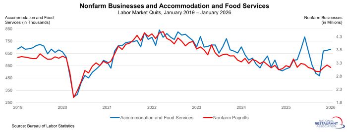 There were 872,000 total separations in the restaurants and accommodations sector in January, according to BLS. That represented the highest level since June 2025 (941k).