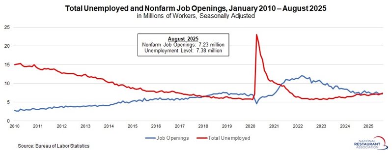 Job openings in the restaurant and lodging sector rose from 880,000 in July to 986,000 in August, marking the highest level in three months. Over the first eight months of 2025, openings averaged 893,000, underscoring steady demand for labor in the accommodation and foodservices industry—perhaps surprisingly resilient given broader economic uncertainties.