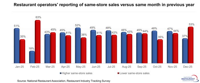 Thirty-seven percent of restaurant operators said their same-store sales rose between December 2024 and December 2025, according to the National Restaurant Association’s monthly tracking survey. That was down from 47% of operators who reported higher sales in November.