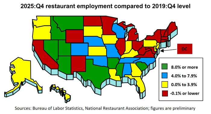 This group was led by West Virginia, which had nearly 6% fewer eating and drinking place jobs in the fourth quarter of 2025 than it did in the fourth quarter of 2019. Maine (-5%), New Mexico (-5%), Massachusetts (-4%) and Illinois (-4%) were also well below their pre-pandemic restaurant employment levels.