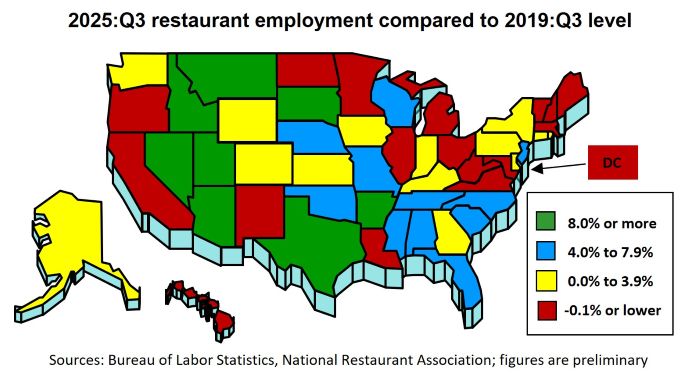 This group was led by Massachusetts, Illinois, West Virginia, Maryland and California, which had about 3% fewer eating and drinking place jobs in the third quarter of 2025 than they did in the third quarter of 2019. Michigan, Minnesota and Vermont remained about 2% below their pre-pandemic restaurant employment levels.