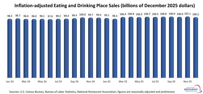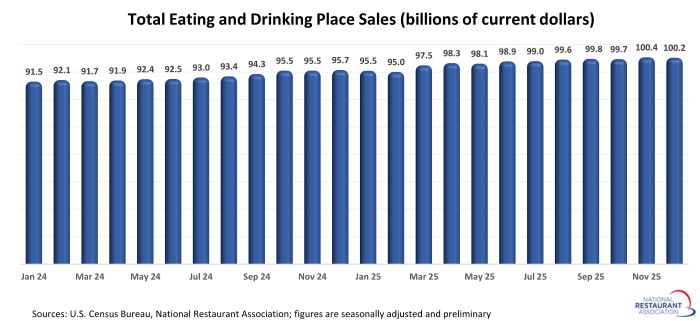 Eating and drinking places registered total sales of $100.2 billion on a seasonally adjusted basis in December, according to preliminary data from the U.S. Census Bureau. That was down slightly from November’s sales volume of $100.4 billion.