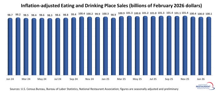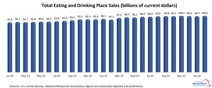 Eating and drinking places registered total sales of $100.1 billion on a seasonally adjusted basis in February, according to preliminary data from the U.S. Census Bureau. That was up 0.4% from January’s sales volume of $99.7 billion.