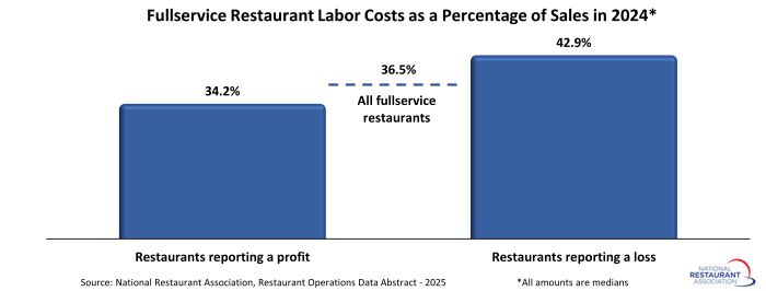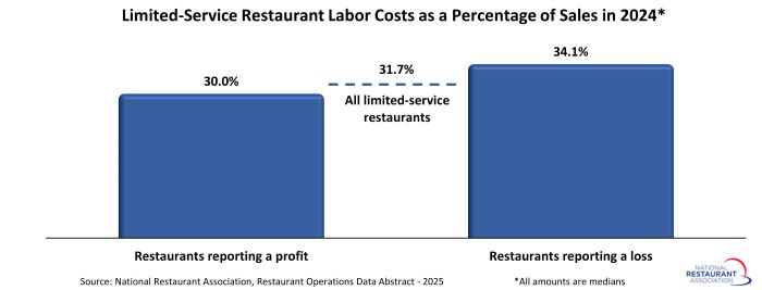 Labor costs represented a median of 30.0% of sales among limited-service operators who reported a pre-tax profit in 2024, and a median of 34.1% of sales for limited-service operators who reported a loss.