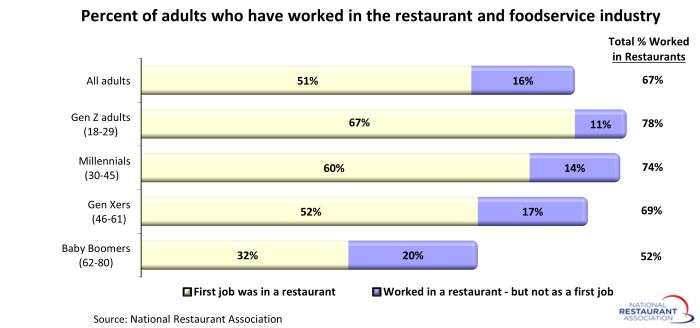 Gen Z adults (67%) and millennials (60%) are the most likely to say they got their first work experience in the restaurant and foodservice industry. Restaurants also provided the first job for 52% of Gen Xers and 32% of baby boomers.