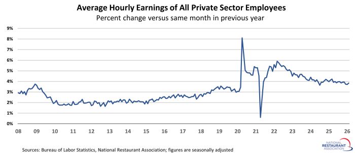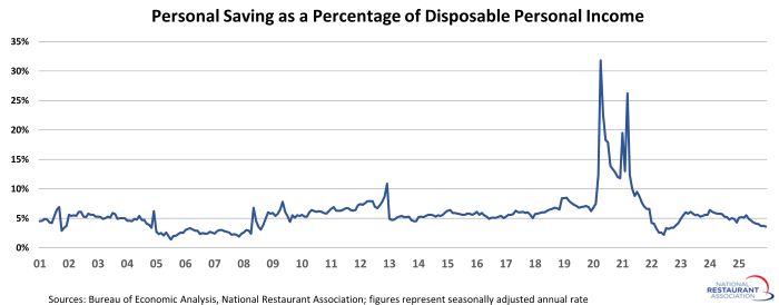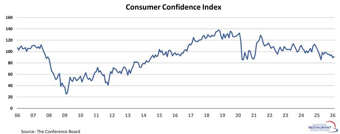Household wealth continues to trend sharply higher, rising by more than $6 trillion in the third quarter of 2025. That followed an increase of more than $7 trillion in the second quarter, and represented seventh increase in the last eight quarters. The only interruption of the positive trendline was a modest dip in the first quarter of 2025, which was due largely to a decline in the stock market. In total during the last eight quarters, total household net worth jumped by nearly $30 trillion. That positively impacts consumers’ willingness to spend on discretionary items, including restaurants.