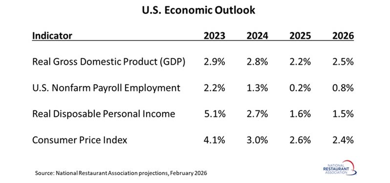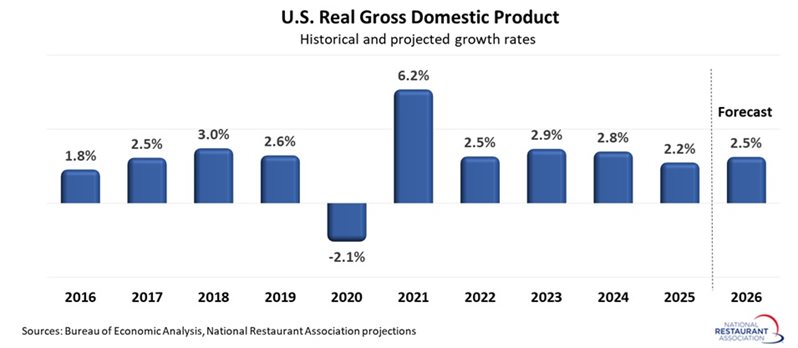 Overall, the U.S. economy has remained surprisingly resilient despite numerous headwinds and a lot of “noise” in the data in 2025. Real Gross Domestic Product (GDP) should rise by 2.2% at the annual rate in 2025, but the National Restaurant Association forecasts 2.5% growth in 2026.