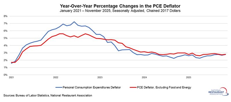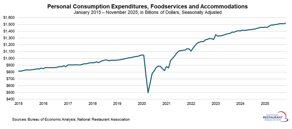Beyond prices, personal consumption expenditures rose 0.5% in October and November, continuing to increase solidly. Spending on foodservices and accommodations edged down 0.1% in October but rebounded by 0.5% in November. Over the past year, total personal spending has grown a healthy 5.4%, with expenditures on foodservices and accommodations up 4.2% since November 2024, signaling surprising resilience in consumer demand despite persistent headwinds.