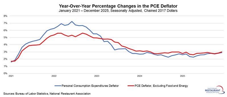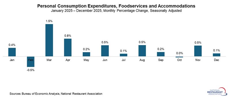 Beyond prices, personal consumption expenditures rose 0.4% in December for the second straight month. Spending on foodservices and accommodations edged up 0.1% in December after jumping by 0.5% in November. Over the past year, total personal spending has grown a healthy 4.7%, with expenditures on foodservices and accommodations up 4.6% since December 2024, signaling surprising resilience in consumer demand despite persistent headwinds and a softer-than-desired reading for December.