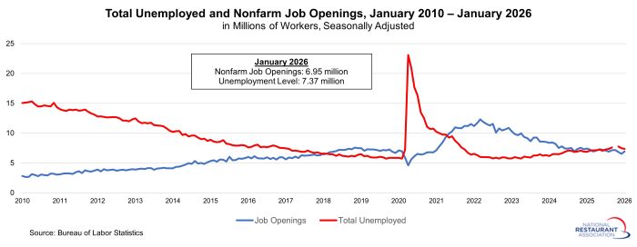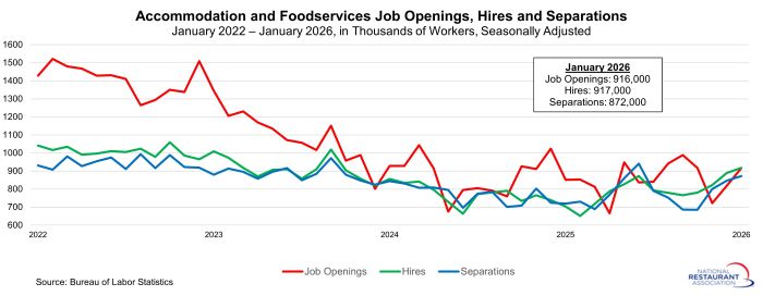 On the last business day of January, there were 916,000 job openings in the combined restaurants and accommodations sector, according to Job Openings and Labor Turnover Survey (JOLTS) data from BLS. That was up from dampened readings in both November (722k) and December (818k).