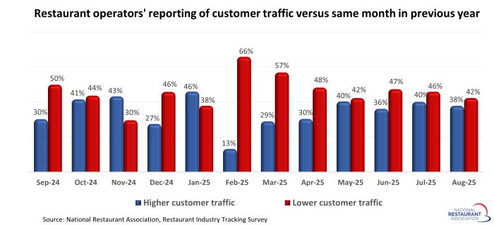 Thirty-eight percent of operators said their customer traffic rose between August 2024 and August 2025, down slightly from 40% in July. Forty-two percent of restaurant operators reported lower traffic in August, compared to 46% in July.