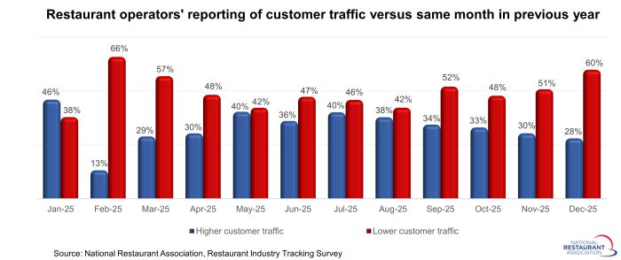 Twenty-eight percent of operators said their customer traffic rose between December 2024 and December 2025, down from 30% in November. Sixty percent of restaurant operators reported lower traffic in December, up from 51% in November.