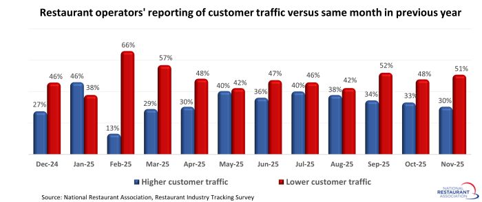 Thirty percent of operators said their customer traffic rose between November 2024 and November 2025, down from 33% in October. Fifty-one percent of restaurant operators reported lower traffic in November, up from 48% in October.