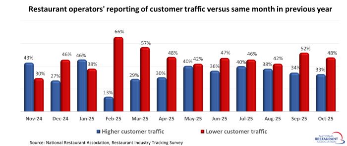 Thirty-three percent of operators said their customer traffic rose between October 2024 and October 2025, compared to 34% in September. Forty-eight percent of restaurant operators reported lower traffic in October, down from 52% in September.