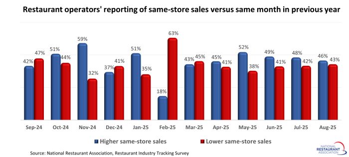 Forty-six percent of restaurant operators said their same-store sales rose between August 2024 and August 2025, according to the National Restaurant Association’s monthly tracking survey. That was down slightly from 48% of operators who reported higher sales in July.