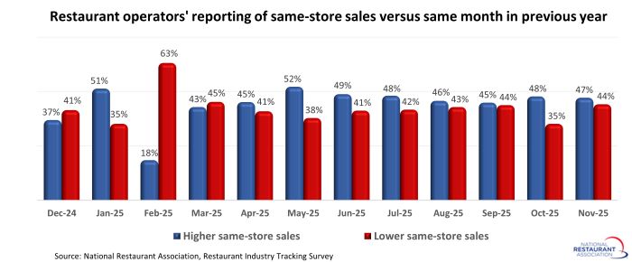 Forty-seven percent of restaurant operators said their same-store sales rose between November 2024 and November 2025, according to the National Restaurant Association’s monthly tracking survey. That was essentially unchanged from 48% in October.