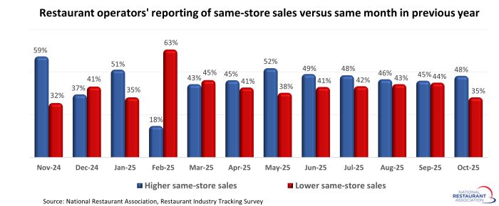 Forty-eight percent of restaurant operators said their same-store sales rose between October 2024 and October 2025, according to the National Restaurant Association’s monthly tracking survey. That was up from 45% in September.