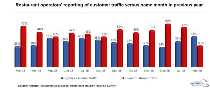 Forty-three percent of operators said their customer traffic rose between February 2025 and February 2026, up from 36% in January. Thirty percent of restaurant operators reported lower traffic in February, down from 55% in January.