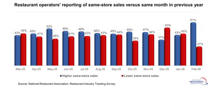 Sixty-one percent of restaurant operators said their same-store sales rose between February 2025 and February 2026, according to the National Restaurant Association’s monthly tracking survey. That was up from 43% who reported higher sales in January.