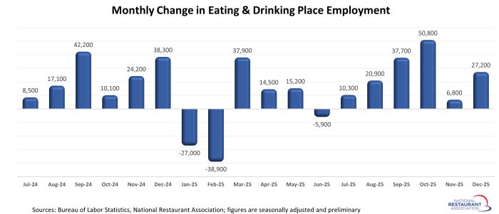 Eating and drinking places added a net 27,200 jobs in December on a seasonally-adjusted basis, according to preliminary data from the Bureau of Labor Statistics (BLS). That was up from a gain of 6,800 jobs in November and represented the 6th consecutive monthly increase in restaurant employment.