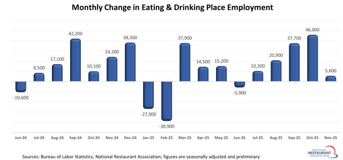 Eating and drinking places* added a net 5,600 jobs in November on a seasonally-adjusted basis, according to preliminary data from the Bureau of Labor Statistics (BLS). While that was well below the strong gain of 46,000 jobs in October, it represented the 5th consecutive monthly increase in restaurant jobs.