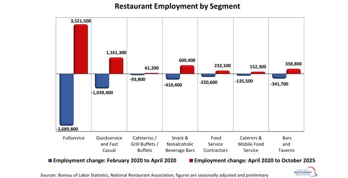 Employment in the limited-service segments recovered much faster from the pandemic-induced job losses. As of October 2025, employment at snack and nonalcoholic beverage bars – including coffee, donut and ice cream shops – was 199,000 jobs (or 24.6%) above February 2020 readings.