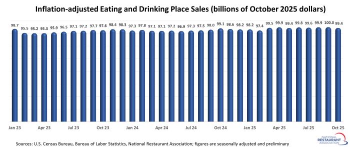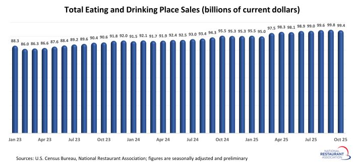 Eating and drinking places posted total sales of $99.4 billion on a seasonally adjusted basis in October, according to preliminary data from the U.S. Census Bureau. That was down 0.4% from September’s downward-revised sales volume of $99.8 billion.