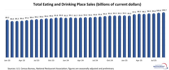 Eating and drinking places registered total sales of $100.7 billion on a seasonally adjusted basis in September, according to preliminary data from the U.S. Census Bureau. That was up 0.7% from August’s upward-revised sales volume of $100.0 billion.