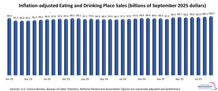 After adjusting for menu price inflation, eating and drinking place sales were up 2.9% between September 2024 and September 2025. That marked the seventh consecutive month with real sales growth above 2%.