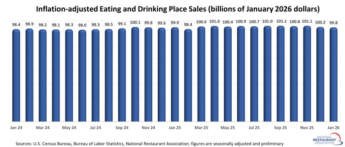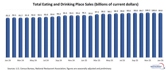 Eating and drinking places registered total sales of $99.8 billion on a seasonally adjusted basis in January, according to preliminary data from the U.S. Census Bureau. That was down slightly from December’s sales volume of $100.0 billion.